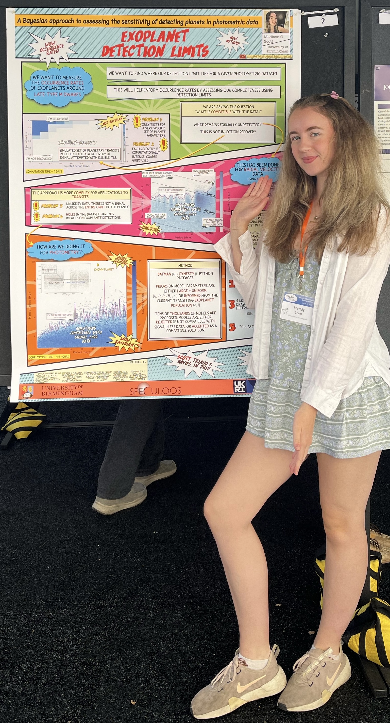 I study exoplanets that orbit late-type M dwarfs, typically with effective temperatures < 3400K. The goal of my research is to determine occurrence rates of exoplanets around these stars; I aim to do this by determining where our detection limits lie for photometric data, in order to assess our sensitivity to detecting planets and thus correct occurrence rates as well as inform follow-up observation efforts. The SPECULOOS telescopes in Paranal, Teide and Mexico offer a chance to obtain ground-based follow-up photometric data in addition to space-based data from e.g. TESS. The advantage of these telescopes is that they obtain better precision for cool M dwarfs compared to the NASA TESS Space Telescope, allowing us to probe a parameter space of planets with smaller radii. We can therefore push down our detection limit compared to TESS, and increase our sensitivity to potentially detecting Earth-sized, habitable zone planets around nearby M dwarfs. Complimentary to this, I am also studying temperate planets around nearby, late-type M dwarfs with the SPECULOOS network. Please don't hesitate to get in touch if you'd like to hear more about my work!